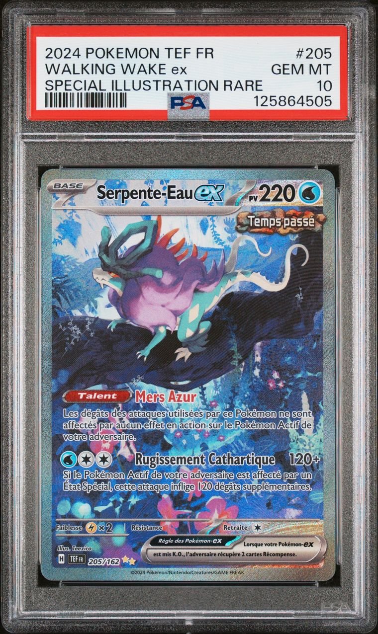 Découvrez la PSA 10 Serpente-Eau ex 205/162, une carte exceptionnelle de la série EV5 : Forces Temporelles. Avec son état Gem Mint et sa note parfaite de 10, cette carte est un véritable bijou pour tout passionné de Pokémon. La Serpente-Eau, avec son design captivant et ses détails minutieux, se démarque par sa rareté et son attrait visuel.